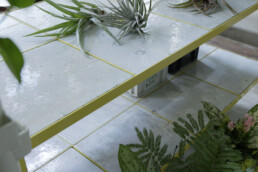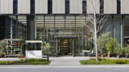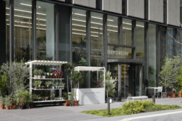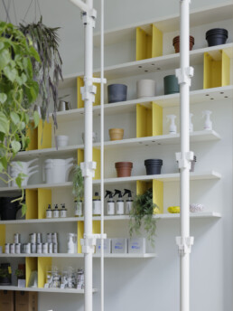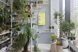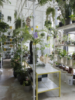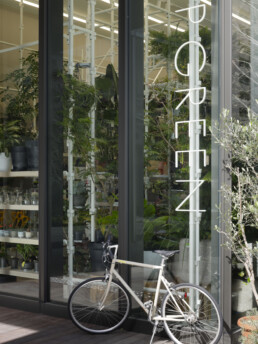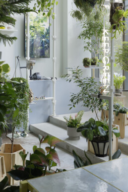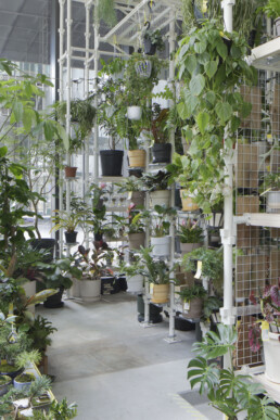 既存の箱の中に足場板を構築し、立体的な回遊性を持たせたGREEN SHOP 天井高さを活かし、立体的に組まれた棚に配置された植物は、森の中に自生した植物のようで、高揚感を感じる空間